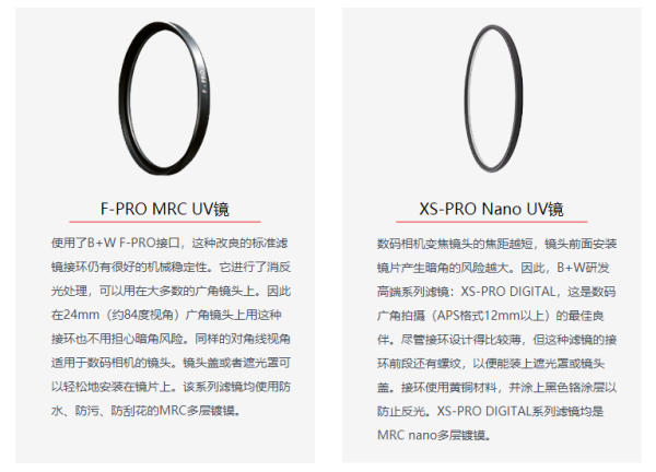 全画幅相机镜头焦距在24MM及以下的选用XS-Pro系列,避免暗角加重甚至出现黑角,而24MM以上的就选用F-Pro系列的就可以了。但必须要记住MRC这个多层镀膜的标识,因为B+W的单层镀膜滤镜在现在这个多层镀膜技术泛滥的市场下真的不值得购买。