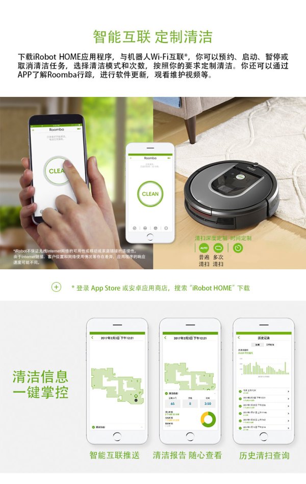 iRobot Roomba 960 扫地机器人同样作为900旗舰系列的产品,在众多核心配置上都参照了Roomba 980。像是Wi-Fi功能,用户可以通过专用的APP实现对其远程控制,以及更多的智能化功能,像是与自家拖地机Braava jet的配合工作;并且新功能VSLAM技术(Vision Simultaneous Localization and Mapping),同样得以保留,扫地机器人在打扫的同时自我学习,绘制房间的地图,以记录房间的结构、重点清扫区域等信息,在之后的打扫中可以很大程度地提升效率。在清洁系统方面,如风机/滚刷等部件,也都是采用了800/900系列的高端配置,相比入门的600/700系列的AeroVac系统,提升了5倍的清洁效率。iRobot的看家本领iAdapt 2.0导航技术也不必多说,始终是与其他品牌竞争的优势之所在。当然,960与980之间200美元的差价,也带来了一些配置的变化,例如锂电池/Gen 3电机等部件的减配,对于实际使用确实能够带来一些影响,然而性价比却更为突出。 值6 点评0 原创6 好价104去购买查看详情出色的路线算法是清洁机器人的关键技术,而iRobot采用自主研发的iAdapt人工智能技术,通过软硬件结合的方式计算出环境中的障碍物,并设定合理的清扫模式,清洁质量和效率卓越。