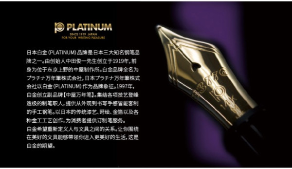 白金(Platinum)品牌成立于1919年,作为日本三大钢笔品牌之一,一直以来致力提升用户书写体验,使书写成为一种享受,由日本中田俊一先生创立于日本,可以说是“冶炼技术的竞争最后由白金划下了句号”,是知名的文具品牌。