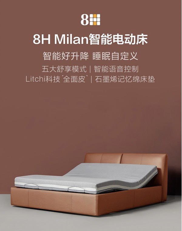 2019年12月,8H Milan智能电动床小米有品众筹上线,接入米家APP,支持小爱同学语音操控,仅需按键或者语音控制,电动床即可缓缓抬起,到达舒适的高度,白天放松体验,夜晚高品质睡眠,一床搞定!