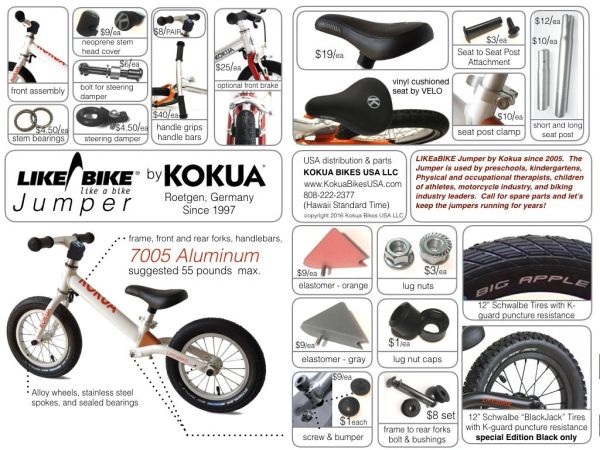 LIKEaBIKE 系列可以让儿童在骑平衡车时跟上大人的锻炼,比如慢跑,轨道旱冰,甚至共同骑单车。这个系列重量仅为34kg,是目前市场上最轻款。前叉和后叉都是航空级别铝合金,座椅下有避震胶,可减小骑行时的震荡。座椅高度调节,适合身高90-110cm,大概是2岁至5岁期间,骑行时间较长。 有角度的后叉脚踏可以在滑行时提供休息的站脚,转量化把手,前叉转向,角度控制,颜色也是多样化,追求个性。