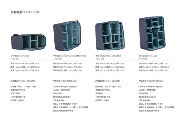 模块化设计或许说不上新鲜,毕竟就是使用内胆嘛。不过Shimoda的内胆还是挺特别的,首先他的内胆使用EVA填充,比一般海绵分隔要薄。Shimoda的内胆包壁和分隔比市面上常见的内胆包要薄近一半。得益于这个设计,他的内胆中可以增加一些窄分割,适合风光摄影师用来存放滤镜这些比较薄却又脆弱的附件。同时它的分割吸收演化了其他品牌可变分割的设计,对内部空间的划分提供了更多的自选方案。另外配上附送的布包,小号内胆可以作为一个单肩包使用。