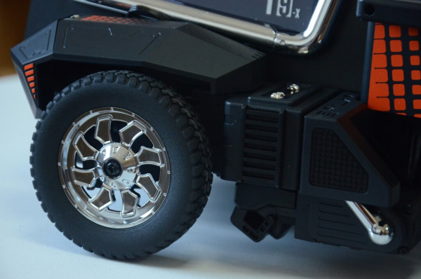 这辆车的造型还是非常科技前卫的,有点科幻片中太空车的样式,这辆车的尺寸为287*198*149MM;采用ABS+PC外壳、橡胶轮胎。车的前端有设计“火炮”,车顶设计了三个车顶大灯,车窗两侧两个镀铬的“排气管”,应该说整个车子的细节都是合理到位,也很有质感。