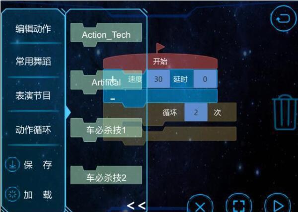 手机APP内目前内置了14个复杂的特技动作,每个动作都十分有趣,有格斗,有跳舞等,只需要点击相应的动作,星际特工就会立刻动起来表演。同时你可以自行编程动作导入到动作特技里面,让星际特工进行表演。
