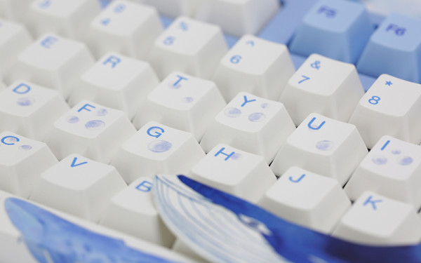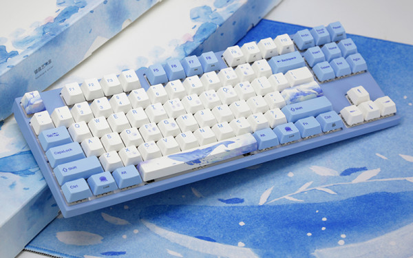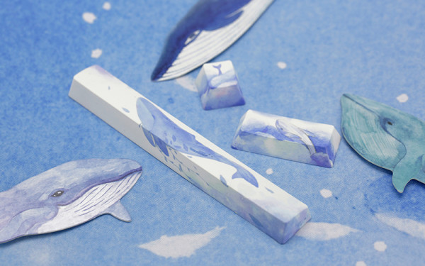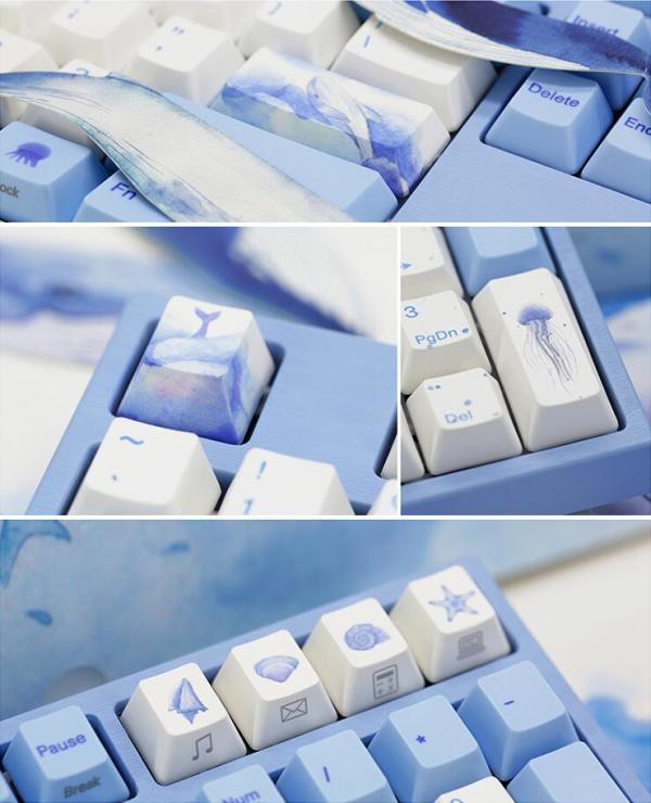 阿米洛 海韵主题键盘发布于2018年,这是一款以鲸落为蓝本展开的优美画卷,键盘整体以淡蓝和白色为主色调,以还原海洋与泡沫的质感,淡蓝色显示出海洋的清新感,ESC、回车和空格三颗按键的图案,分别描绘了鲸鱼遨游、翻腾和入水的场景,白色键帽上的蓝色泡沫,与空格键上遨游的鲸鱼更加栩栩如生。