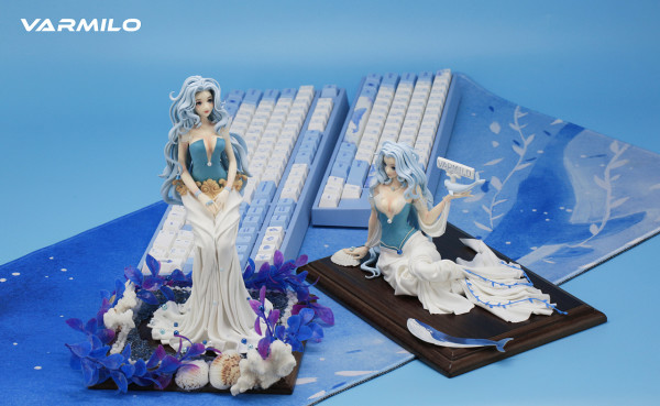 除了键盘本身之外,阿米洛海韵还有很多主题配件,海韵主题的桌布拥有小、中、大和超大4个型号5种款型,最小号只有常规的鼠标垫大小,最大号可以覆盖到整个桌面。随键盘附赠的了8张明星片,阐释了以鲸落为蓝本的海韵故事。以及限量售卖的海韵主题手办——鲸落女神,拥有站立和侧坐两种款型。搭配这些海韵风格的配件,将改善你桌面的整体风格,沉浸在阿米洛为你打造的主题海洋之中。