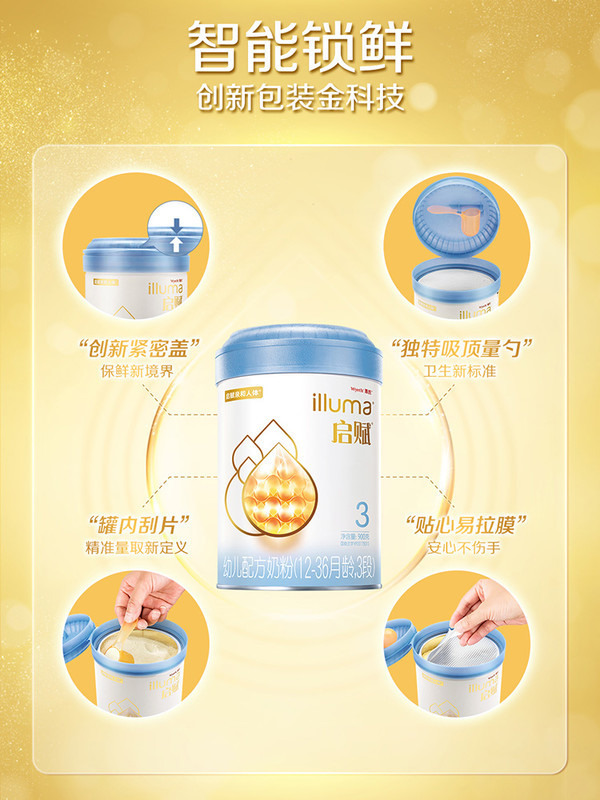 惠氏蓝钻启赋采用3层创新紧密盖设计,保鲜效果一流;罐口采用贴心的易拉箔膜设计,不仅设计边缘圆滑安全不伤手,好拉开,还能确保使用前的密封性;生产信息、产品成分等详细情况都有在奶粉罐上注明,方便追溯查源,让家长更放心。