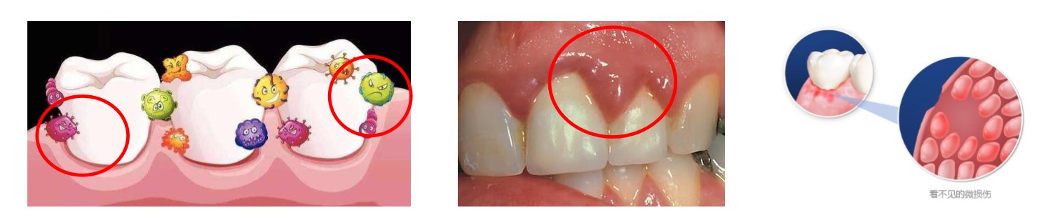 要解决这个问题,首先我们要搞清楚牙龈为什么会红肿出血?煲剧、加班、夜宵?其实这些都是间接因素,而最直接的原因就是牙齿没刷干净,残留的牙菌斑在作妖!我们常说的“上火“其实是因为口腔被细菌感染,使得牙龈处于充血状态,在外部刺激(比如刷牙)的作用下就极易出血。而出血并不是问题的重点,残留的毒素和细菌会源源不断地试图侵入身体,牙龈抵挡不住之后,会选择躲避,最后就会演变为牙龈萎缩,牙缝变大的问题。
