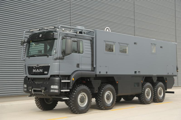 先看外观,硬朗的MAN车头从内到外透着一股威严与霸气,超高的底盘,8个粗壮的米其林的 XZL14.00R20全地形轮胎,亚光色的德国进口玻璃钢蒙皮,看上去如同一辆军用装甲车。