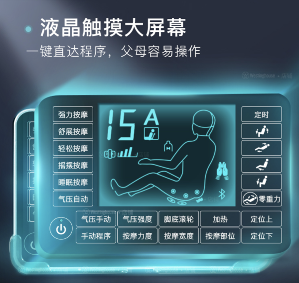 S500全自动按摩椅采用宽敞太空舱设计,并配备大液晶触屏, 一键直达程序,老人也能轻松使用;搭载西屋研制的智能芯片,可调整揉捏、捶打、叩击、 推拿等多种按摩手法和多种自动及手动按摩程序;