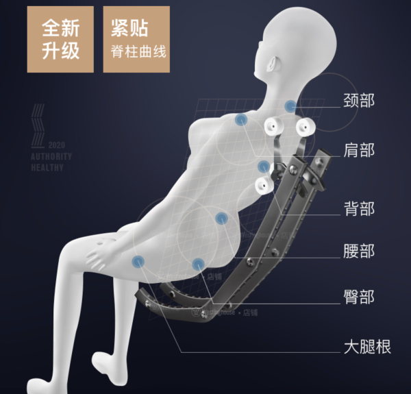 5套经典按摩程序,可针对重点穴位、关键部位着重按摩;5档机械手按摩力度、5档气囊按摩力度 ,一家老少都能找到合适的力度;SL导轨130厘米贴合亚洲人体曲线,让机械手从肩到大腿根舒畅按摩。
