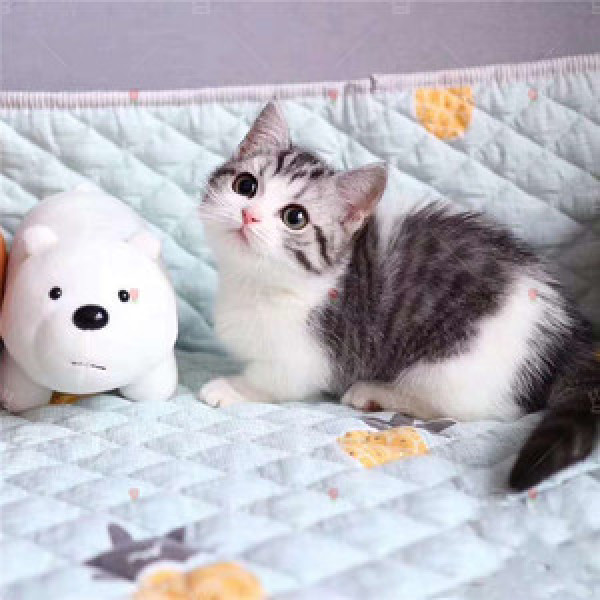 美短加白就是美短与白猫的混血,背部是美短的灰黑色,腹部是纯白色,起司猫的原型就是美短加白。而如此美丽的身形,再混血上曼基康的小短腿,无论谁看到之后都无法抵抗他的可爱。