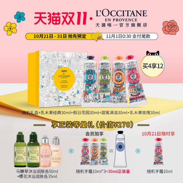 欧舒丹携手创意涂色设计师品牌OMY,联名推出“2020双十一乳木果涂色限定系列”。可以根据自己的喜好为手霜上色,解锁属于自己的限定款护手霜。