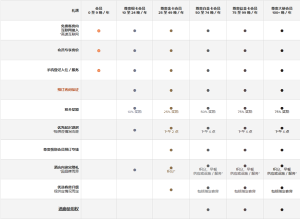 尊贵白金卡会员:50%奖励积分、优选客房升级(包括指定套房)、迎宾赠礼(可在500/1,000点积分、早餐或提供的设施/用品中任选)、行政酒廊使用权、下午4点延迟退房、50晚年度礼遇选项(五晚套房住宿礼遇等);