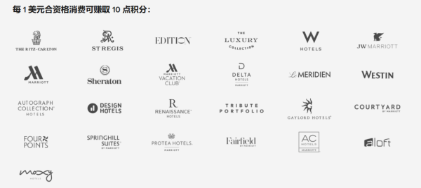 积分赚取:每 1 美元合资格酒店消费将赚取 10点积分。(源宿酒店、Residence Inn 酒店以及TownePlace Suites 酒店除外,此三个品牌每 1 美元合资格消费将赚取 5 点积分。下榻ExecuStay 公寓和万豪行政公寓只有积分)