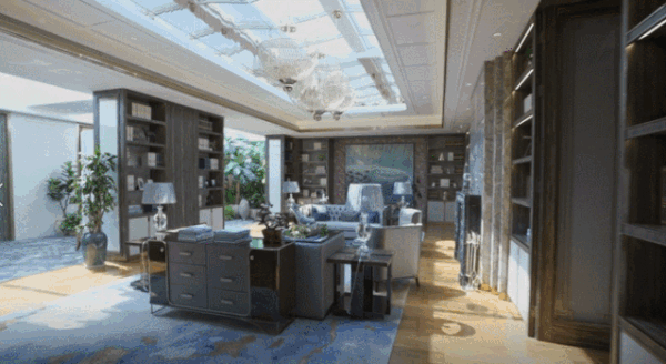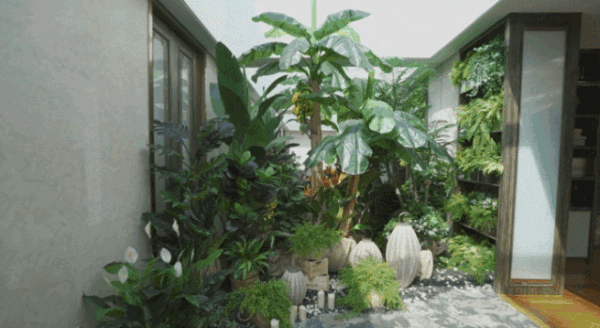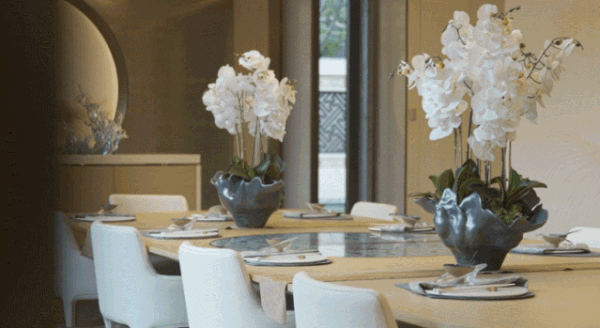 就采用了合院构造(点击蓝字观看视频),上面的动图是它其中一个餐厅,餐厅和门厅建筑形成的夹角,把院子环抱其中。 除了主院,合院别墅有时还会加入天井,让整个空间更加通透。