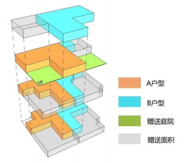 上图是洋房姐姐 拍过的一套项目的结构图,看着又像双拼又像叠拼。一正一反两个“L形”体块“卡”在一起。