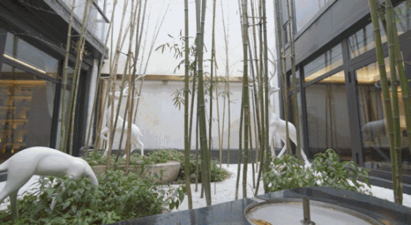 小天井中的小鹿和绿竹,把自然延伸到室内。 现在市场上合院形式的别墅非常多,洋房姐姐拍过的也有好几套了,相比独栋别墅的平铺直叙,合院更彰显中式园林“含蓄、曲折”的韵味,还在确保通风、采光、私密性的同时,迎合了政策对容积率的要求。