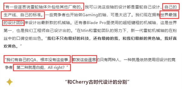 譬如Razer 雷蛇RCEOMin在2017年5月的直播里一直吐槽CHEERY 轴太古老太落伍了,压根不是给玩家设计的东西。