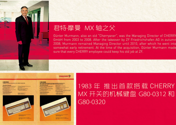 而研发出MX轴体的是CHERRY的Gunter Murmann。当然光有轴体还不够,与此同时搭载MX轴并面世的G80 开始面世,目前G803000系列仍旧经久不衰,其中个别款的产品寿命已经接近30年,这对于数码产品而言堪称奇迹。