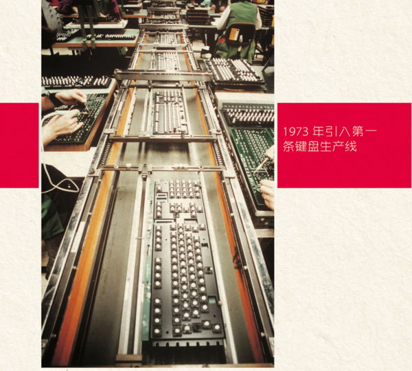 1973年CHERRY引入第一条键盘生产线(德国),当时的装配需要通过手工来完成(厂妹?)。那一年距离柏林墙被推倒,东德西德走向合并还有17年。