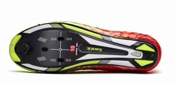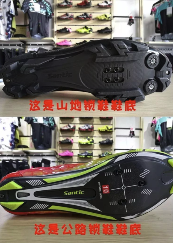 从功能上来说,锁鞋分为公路锁鞋和山地、铁三这三种。那要怎么区别呢?很简单,看鞋底:山地锁鞋的鞋底有足钉,锁片是两孔;而公路锁鞋和铁三鞋的鞋底一般是三孔,少部分公路锁鞋采用兼容棒棒糖的四孔设计。