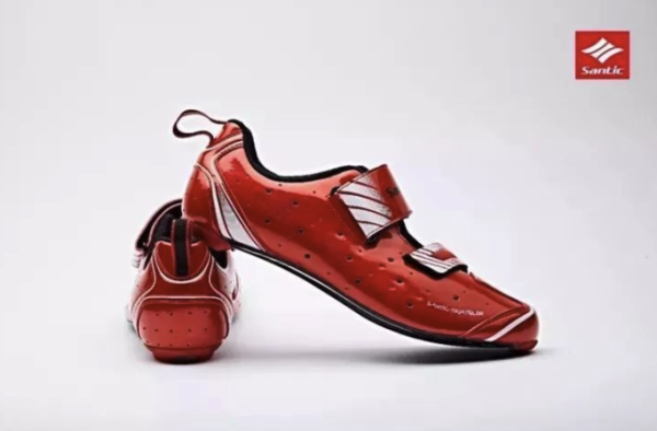 虽然铁三鞋与公路锁鞋的鞋底是差不多,但是在设计上还是有一些区别的,只有两条魔术贴和有后跟拉环——因为专业的铁人三项比赛中争分夺秒,需要在转换区节省时间,所以铁人们穿脱锁鞋都是在骑车的过程中完成的,为了穿脱方便,铁三鞋比公路锁鞋少一条魔术贴和增加后跟拉环,且没有锁扣设计,仅仅是方便的魔术贴扣带。