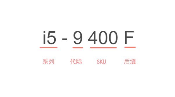 i5-9400F这个型号里一共有四个信息:系列、第几代、SKU型号、后缀。
