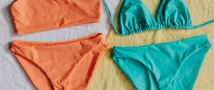 其造型设计为两片三角形布料覆盖着女性上身的乳 房,下身的两片三角形布料则覆盖着前方的鼠蹊部和后方的臀部。下身比基尼的尺码范围从骨盆全覆盖到暴露性的G弦裤和丁字裤。