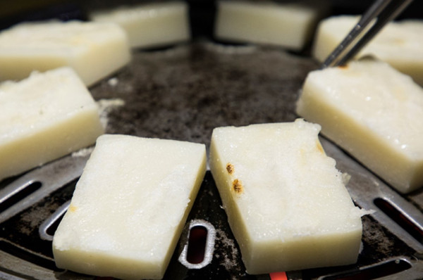 又称糍粑。将糯米用水浸泡一天以上,将水滤干之后蒸熟。将蒸好的糍粑放在石臼里面,用大木槌等工具舂烂至胶状。然后将这团胶状物放入洒上糯米粉的器皿中揉搓,有些地区由两人进行,一个拿着木槌站着敲打,另外一个蹲着用手将糍粑揉成团状。每打一下揉一次。用模具制成各种形状或直接制成饼状或团状,其大小会依据具体的用途而定。放在通风干燥的地方晾干。待要食用时,可以油炸,水煮或直接用火烤熟。