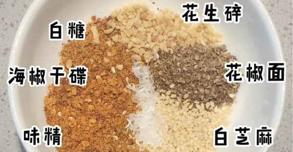 2勺海椒干碟十1勺花椒面十1勺白芝麻十1勺花生碎十1勺花椒面十1小勺味精十1小勺白糖