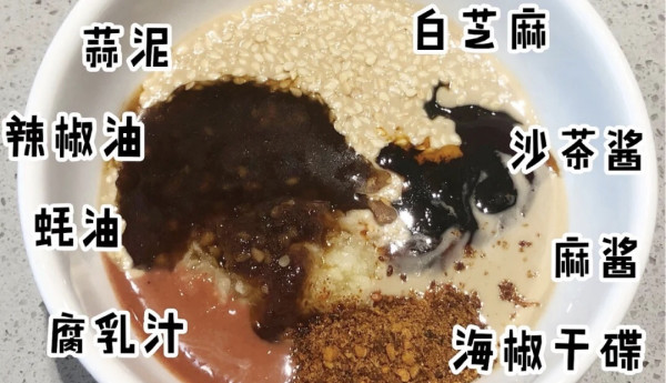 2勺麻酱十1勺沙茶酱十1勺海椒干碟十1勺蒜泥十1勺辣椒油十1勺蚝油十1勺腐乳十1勺白芝麻