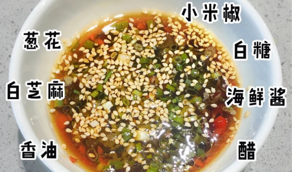 1勺瑶柱香菇酱十2勺海鲜酱油十1勺陈醋十1勺小米辣十1勺酥黄豆十1勺蒜泥十1勺花生碎十1勺小米辣十适量香菜