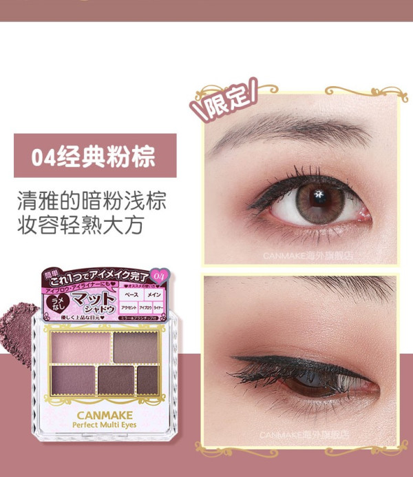 3CE MOOD RECIPE 九色眼影盘 8.1g3CE是韩国Style nanda(2017年被欧莱雅集团收购)旗下彩妆品牌,中文名三熹玉,致力于打造个性鲜明的风格彩妆,在亚洲地区深受欢迎,近年来3CE更是摆脱了“鸡肋韩妆”的大环境困扰,推出了许多品质和颜值双在线的彩妆品,在网络上的讨论度很高,国内丝芙兰也设有它家的柜台。这款MOOD RECIPE 九色眼影盘,是它家近年来在国内最火的彩妆单品之一,方方正正的九宫格包装,加上温柔可爱的配色,让它成为一盘非常适合亚洲女孩时常使用的多功能眼影盘,9个色块包含了大地色、眼窝色、重点色、眼线色,能够轻松完成有层次感的眼妆,也可以根据心情和需求创意多种色彩搭配。三盘配色都不跳出暖色调的大地色,使用起来很顺手,其中最受欢迎的是OVERTAKE色号,粉橘南瓜盘配色,生动有趣且日常,包含了缎光、水光亮片、哑光质地,可以打造出有透明感的温柔眼妆。 值0 点评1 原创0 好价5去购买查看详情CANMAKE五色哑光眼影04号色,灰调的干枯粉配色,可以大面积打底出干枯的基调色,上色均匀,大面积的眼窝晕染可以增加立体感。可棕可粉。